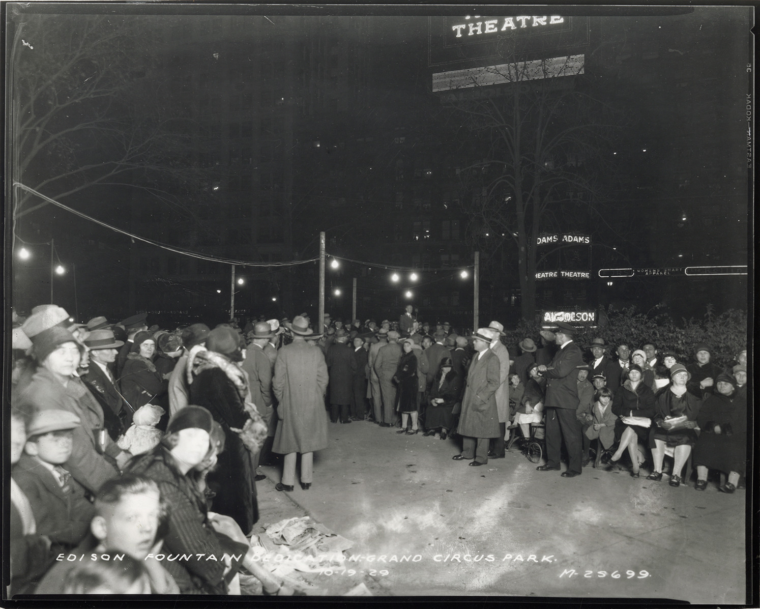 View of crowd gathered for the dedication of the Edison Fountain, located at Grand Circus Park. Fountain was erected in honor of Thomas A. Edison, commemorating the 50th anniversary of his electric incandescent lamp. Printed on front: "Edison Fountain dedication, Grand Circus Park, 10-19-29."