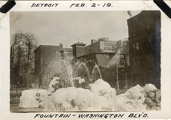 Favorite this☆ Ice fountain, Washington Boulevard Description: View of ice fountain on Washington Blvd. Handwritten on front: "Detroit, Feb. 2-19. Fountain, Washington Blv'd." Handwritten on back: "2 Feb 1919." Details Resource ID: bh028827 Subject: Fountains--Michigan--Detroit Ice--Michigan--Detroit Photographic prints Date Issued: 1919-02-02 Format: 1 photographic print ; 2.5 x 3.5 in. Member of: Burton Historical Collection Filing Location: D/Fountains-Ice Rights: Physical rights are retained by DPL. Copyright is retained in accordance with U.S. copyright laws.