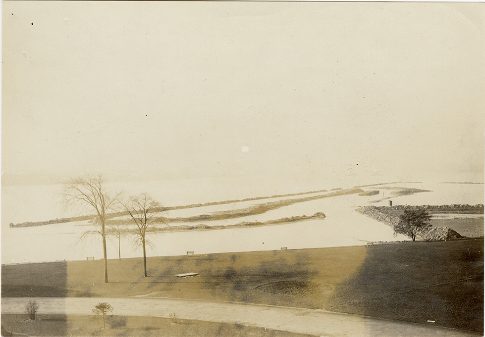View of the fill for of the James Scott Fountain. Fountain is located on Belle Isle and was designed by Cass Gilbert. Handwritten on back: "Date: Nov. 16, 1921. Subject: General view. Locality: B.I. Site: W. end showing fill & progress of work on Scott Mem. Fountain."