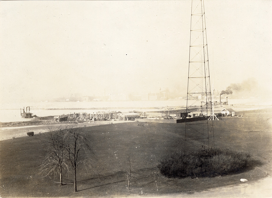 View of the fill for of the James Scott Fountain. Fountain is located on Belle Isle and was designed by Cass Gilbert. Handwritten on back: "Date: Nov. 16, 1921. Subject: General view. Locality: B.I. Site: W. end showing fill & progress of work on Scott Mem. Fountain."