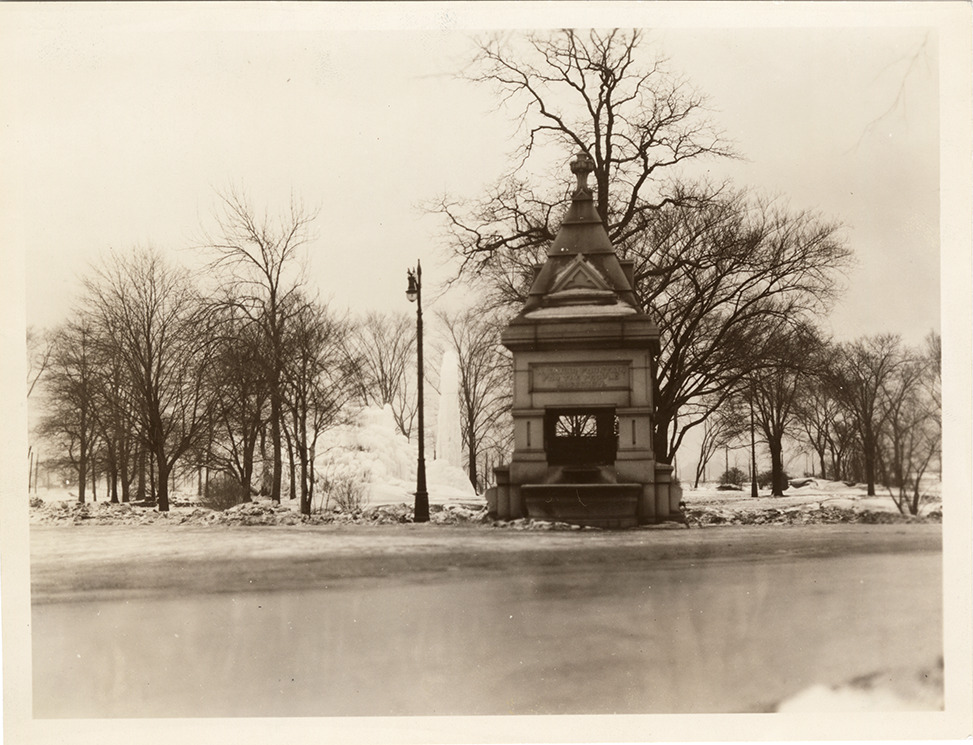 View of the Muir Memorial Fountain on Belle Isle. Inscribed on fountain: "W.K. Muir Fountain for the people. MDCCCXCVI." Handwritten on back: "Muir Fountain, erected 1896 on Belle Isle, moved to upper end of isle in 1938. Orig. cost $3000.00. 1-30-30."