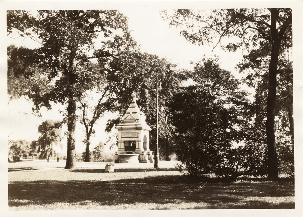 View of the Muir Memorial Fountain on Belle Isle. Inscribed on fountain: "W.K. Muir Fountain for the people. MDCCCXCVI." Handwritten on back: "Muir Fountain, erected on Belle Isle in 1896, moved to upper end of island 1938. Orig. cost $3000.00. 7-2-30."