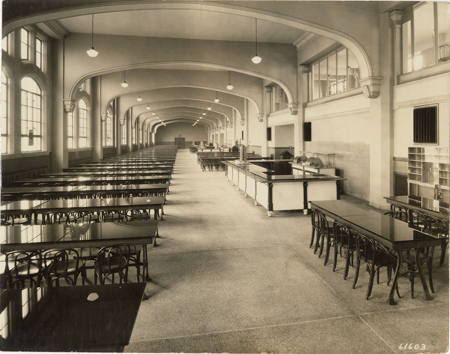 View of the cafeteria at Cass Technical High School, showing cafeteria line, tables and chairs. Stamped on back: "Manning Bros., commercial photographers. 504-505 Lincoln Building. Corner State and Park Sts., Detroit, Mich." Handwritten on back: "Lunch room, Cass Tech."