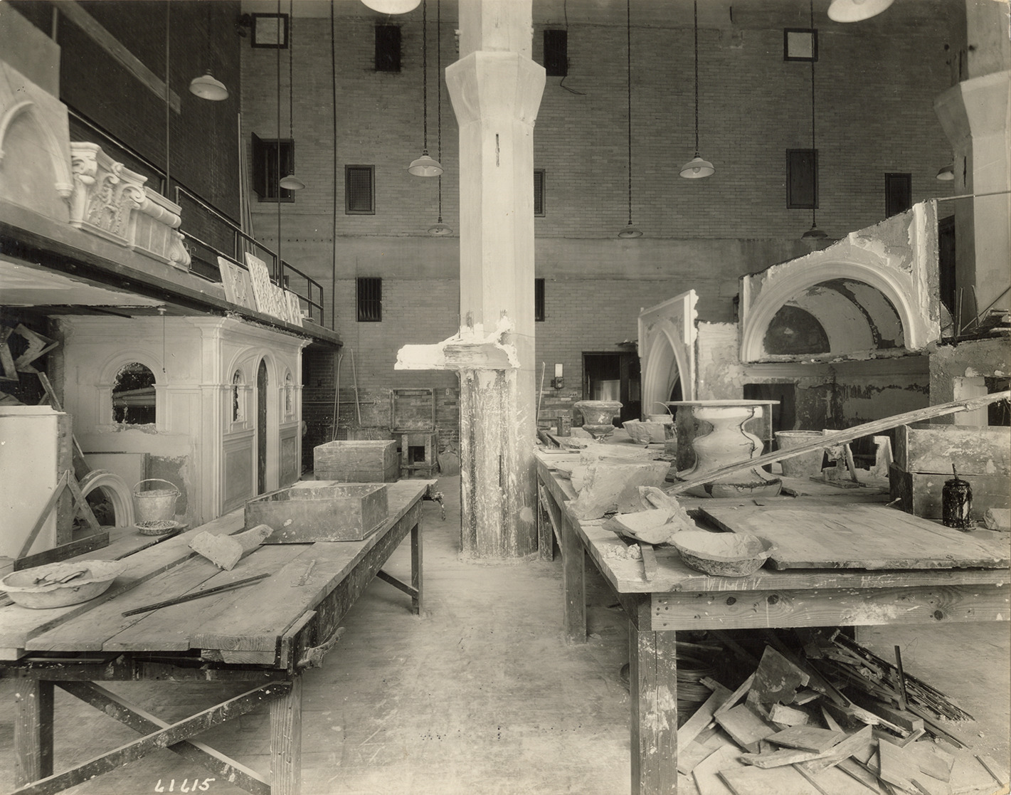 View of a decorative plasterwork area with workbenches, possibly a workshop for students, at Cass Technical High School. Stamped on back: "Manning Bros., commercial photographers. 504-505 Lincoln Building. Corner State and Park Sts., Detroit, Mich." Handwritten on back: "Building construction, Cass Tech. High."