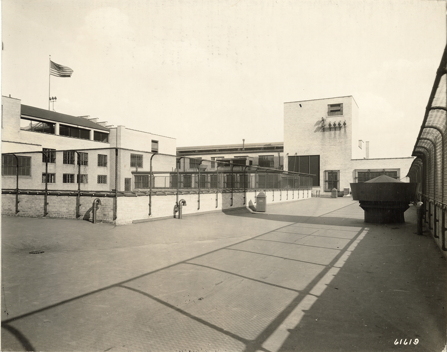 View of the recreation roof at Cass Technical High School. Stamped on back: "Manning Bros., commercial photographers. 504-505 Lincoln Building. Corner State and Park Sts., Detroit, Mich." Handwritten on back: "Recreation roof, Cass Tech. High."