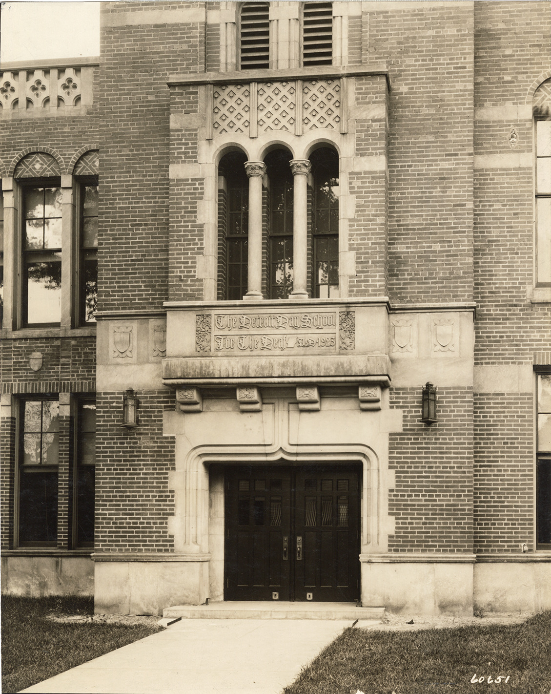 View of the entrance to the Detroit Day School for the Deaf. Stamped on back: "Manning Bros., commercial photographers. 504-505 Lincoln Building. Corner State and Park Sts., Detroit, Mich." Handwritten on back: "Entrance, Detroit Day School for the Deaf."