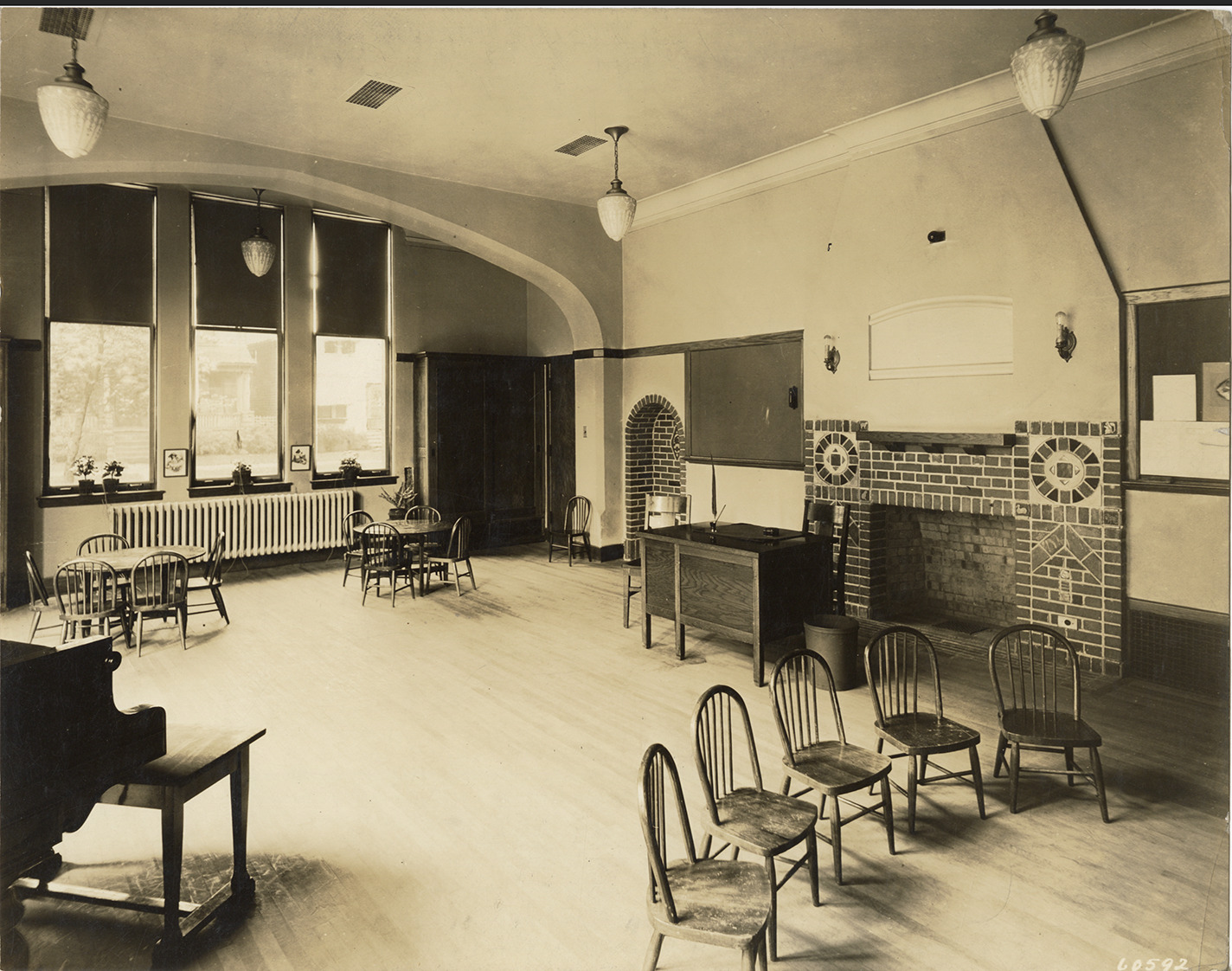 View of the kindergarten classroom at the Detroit Day School for the Deaf. Room is furnished with tables, chairs and piano. Fireplace on right. Handwritten on back: "Kindergarten, Detroit Day School."