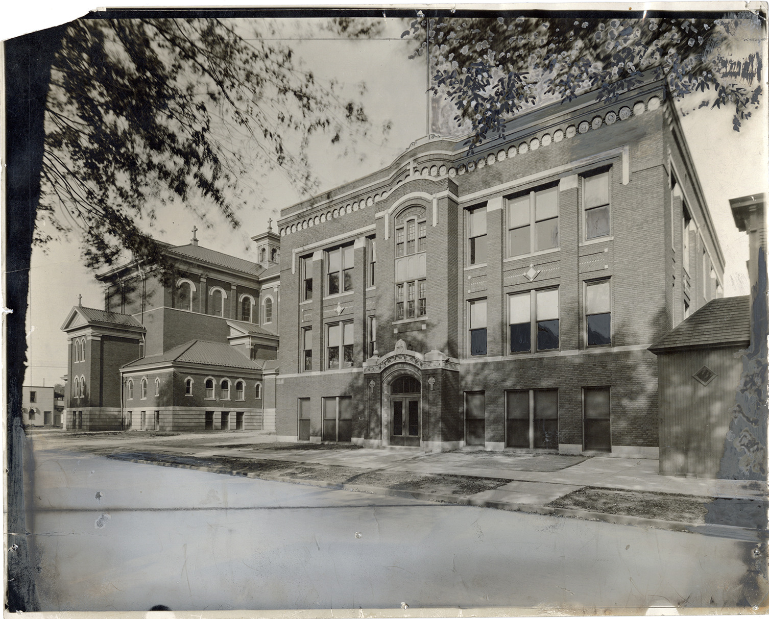 View of the St. Charles de Borromeo School. Stamped on back: "Quay & Falkner, Detroit." Handwritten on back: "St. Charles de Borromeo School, Detroit, Mich. E. side Townsend betw. St. Paul & Agnes."