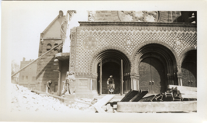 Favorite this☆ Workers removing facade of First Presbyterian Church Description: View of workers removing facade of the First Presbyterian Church to accommodate the widening of Woodward Avenue. Man pushes wheelbarrow under arch. Stamped on back: "Mar 2 1935." Details Resource ID: bh028998 Subject: Presbyterian church buildings--Remodeling--Michigan--Detroit First Presbyterian Church (Detroit, Mich.) Photographic prints Date Issued: 1935-03-02 Format: 1 photographic print ; 3 x 4.75 in. Member of: Burton Historical Collection Filing Location: D/Churches-Presbyterian-First Rights: Physical rights are retained by DPL. Copyright is retained in accordance with U.S. copyright laws.