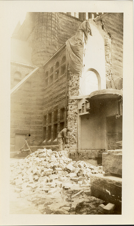 Favorite this☆ Workers removing facade of First Presbyterian Church Description: View of workers removing facade of the First Presbyterian Church to accommodate the widening of Woodward Avenue. Stamped on back: "Mar 2 1935." Details Resource ID: bh029002 Subject: Presbyterian church buildings--Remodeling--Michigan--Detroit First Presbyterian Church (Detroit, Mich.) Photographic prints Date Issued: 1935-03-02 Format: 1 photographic print ; 4.75 x 3 in. Member of: Burton Historical Collection Filing Location: D/Churches-Presbyterian-First Rights: Physical rights are retained by DPL. Copyright is retained in accordance with U.S. copyright laws.