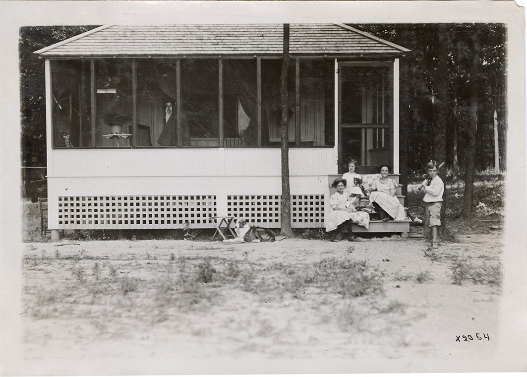 View of the MacFarland family children posing in front of a summer cottage at Cass Lake. Dog in foreground. Handwritten on back: "MacFarland's children at Cass Lake."