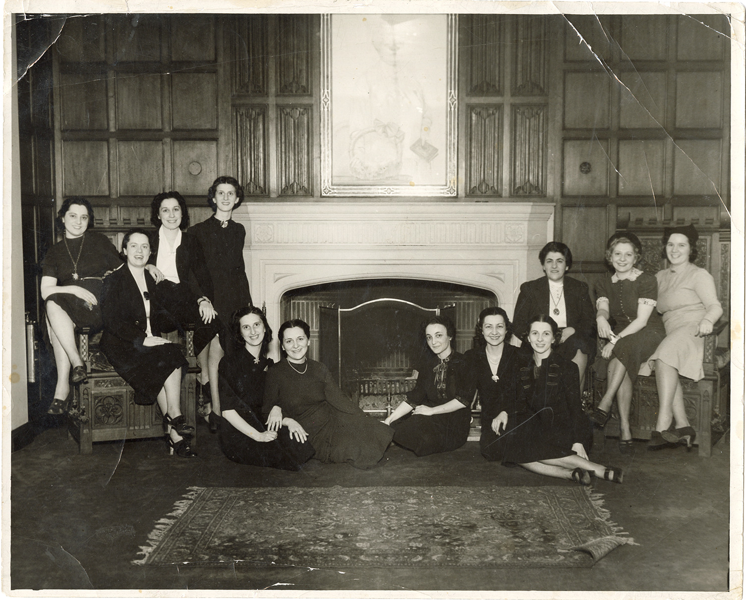 Group portrait of young women, members of the Delta Iota Sigma sorority, posing at the Women's City Club. Fireplace in background. Handwritten on back: "Delta Iota Sigma sorority at Women's City Club that became a police station. Affiliated with Wayne State. American girls of Italian descent. Lucy Pucci, Ida Pozzuto Weeks, Jackie & Eva Alonzo."