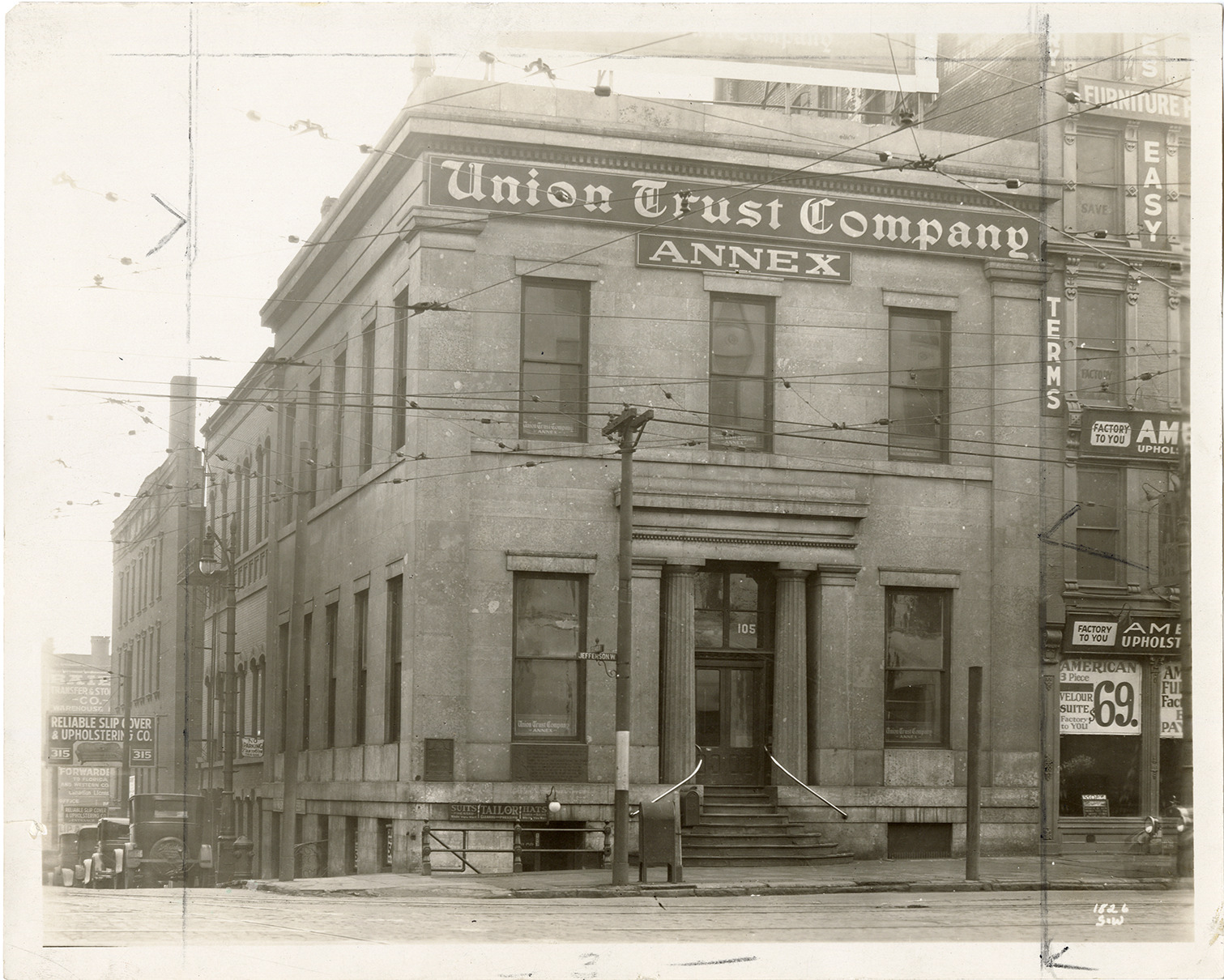 View of the Union Trust Company Annex, located at the corner of Jefferson Avenue and Griswold Street. Tablet commemorating the Conspiracy of Pontiac on building facade. Stamped on back: "Spencer & Wyckoff, commercial photographers, Detroit." Handwritten on back: "Jefferson & Griswold."