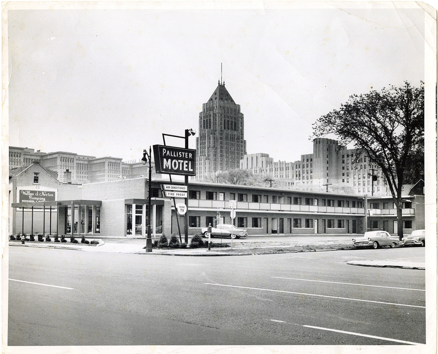 Favorite this☆ Pallister Motel Description: View of the Pallister Motel, located at Woodward Avenue and Pallister. Fisher building and General Motors building in background. Automobiles parked in street. Handwritten on back: "Woodward & Pallister." Details Resource ID: bh029068 Subject: Motels--Michigan--Detroit Office buildings--Michigan--Detroit General Motors Corporation Photographic prints Date Issued: Unknown year Format: 1 photographic print ; 8 x 10 in. Member of: Burton Historical Collection Filing Location: D/Motels Rights: Physical rights are retained by DPL. Copyright is retained in accordance with U.S. copyright laws.