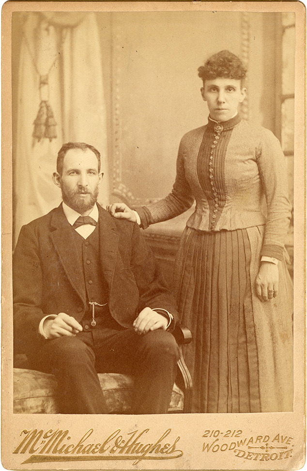 Portrait of Robert I. Wright and Jessie Stewart Watson Wright. Printed on front: "McMichael & Hughes, 210-212 Woodward Ave., Detroit." Handwritten on back: "Dad's stepfather & his mother. Robert I. Wright, 1850- . Jessie Stewart Watson, 1858-1909. Grandparents of Richard Milton Wright."