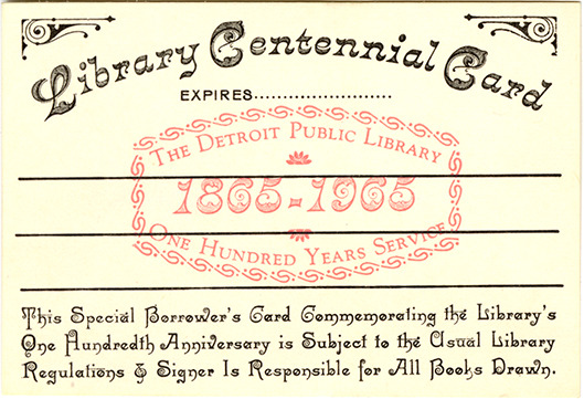 View of a Detroit Public Library centennial library card. Printed on front: "Library centennial card. Expires [blank]. The Detroit Public Library, 1865-1965, one hundred years of service. This special borrower's card commemorating the Library's one hundredth anniversary is subject to the usual library regulations & signer is responsible for all books drawn."