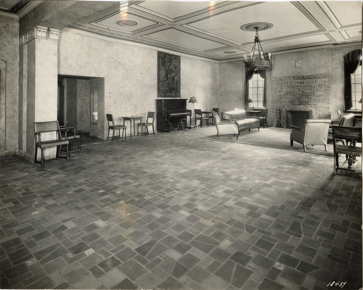 View of the Older Boys' Social Room at the Y.M.C.A. Room is furnished with tables, chairs, sofa and piano. Fireplace in background. Label on back: "Y.M.C.A. unit, Detroit, Michigan. Older Boys' Social Room." Label includes a list of floor tile sizes and colors.