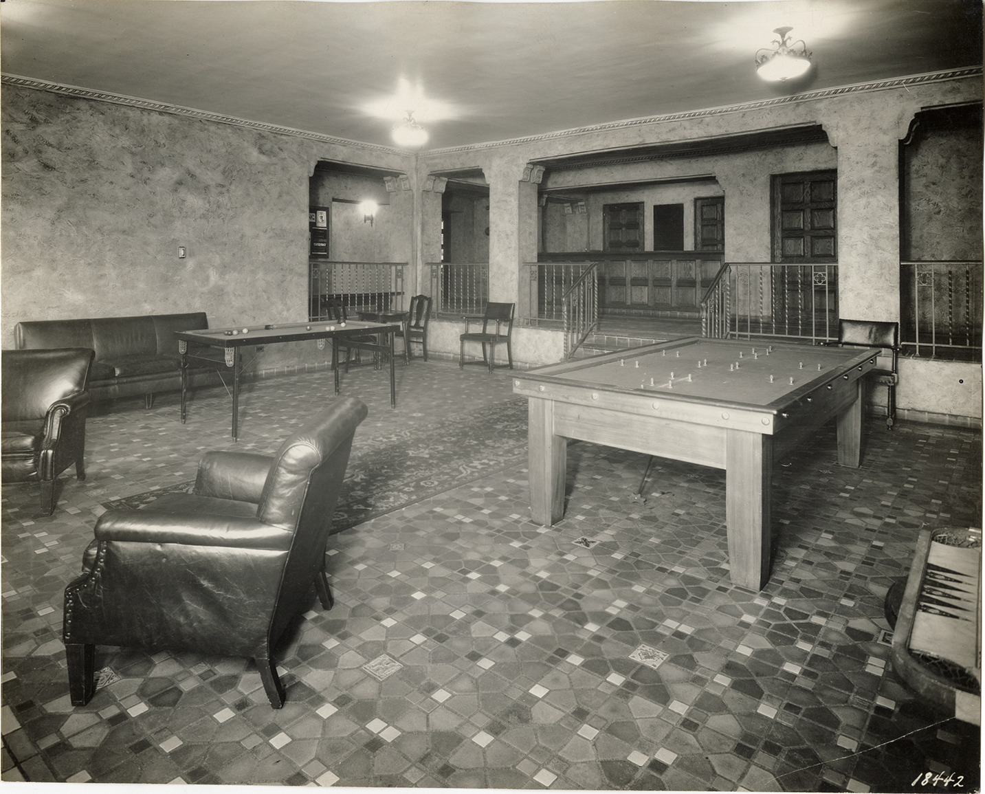 View of the Younger Boys' Social Room at the Y.M.C.A. Room is furnished with pool, snooker and backgammon tables, as well as chairs and a sofa. Label on back: "Y.M.C.A. unit, Detroit, Michigan. Younger Boys' Social Room." Label includes a list of floor tile sizes and colors.