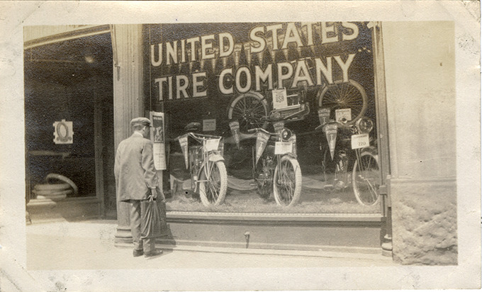 View of a man looking at Reading Standard and Flanders motorcycles in the window of the United States Tire Company.
