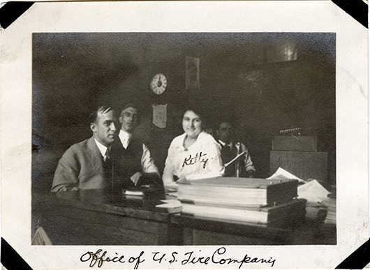 Favorite this☆ Office staff, United States Tire Company Description: View of office workers at the United States Tire Company. Woman is identified as "Kitty." Ledgers in foreground; clock in background. Handwritten on front: "Office of U.S. Tire Company." Details Resource ID: bh029116 Subject: United States Tire Company--Employees United States Tire Company Tire industry--Michigan--Detroit Photographic prints Date Issued: Unknown year Format: 1 photographic print ; 2.5 x 3.5 in. Member of: Burton Historical Collection Filing Location: D/Industries and business houses--United States Tire Company Rights: Physical rights are retained by DPL. Copyright is retained in accordance with U.S. copyright laws.