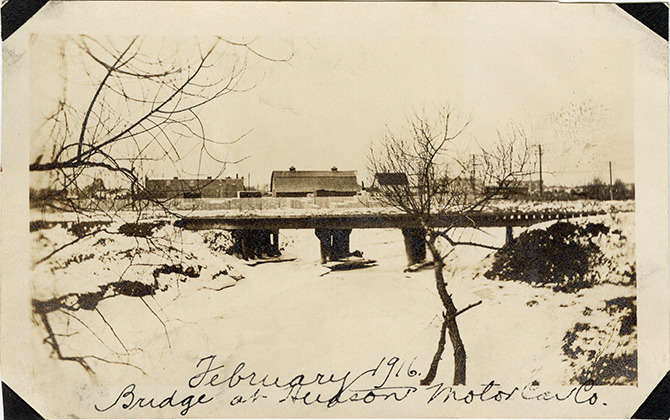 View of a bridge at the Hudson Motor Car Company factory. In late 1915, the company purchased three acres along Connor's Road for the erection of a new engine house, power plant and additional buildings. Handwritten on front: "February, 1916. Bridge at Hudson Motor Car Co."