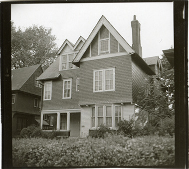 View of three-story wooden-frame house with covered entry porch at 971 Burns, formerly 195, in the Indian Village neighborhood of Detroit, Michigan. The house was built in 1900 and formerly owned by William Kales. Handwritten on back: "971 (195) Burns." Original photograph is reversed.