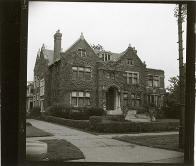 View of three-story brick and stone Chateauesque style house at 982 Burns, formerly 200, in the Indian Village neighborhood of Detroit, Michigan. The house, formerly owned by Frederick Ducharme, was built in 1918 and designed by Smith, Hinchman and Grylls. Handwritten on back: "982 (200) Burns." Original photograph is reversed.
