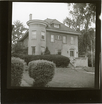 View of a two-story brick house with turret at 991 Burns, formerly 207, in the Indian Village neighborhood of Detroit, Michigan. Handwritten on back: "991 (207) Burns." Original photograph is reversed.