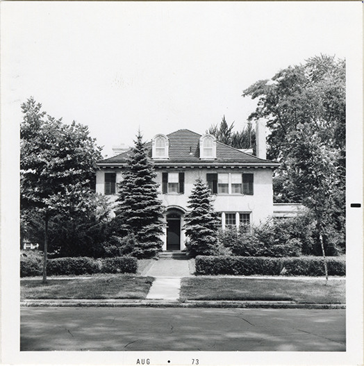 View of a two-story French Eclectic style stucco house at 1086 Burns, formerly 256, in the Indian Village neighborhood of Detroit, Michigan. Designed by Smith, Hinchman & Grylls for Charles G. Lothrop. Printed on front: "Aug 73." Handwritten on back: "1086 (256) Burns."
