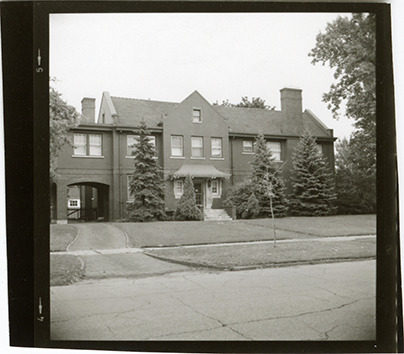 View of a two-story brick house at 2152 Burns, formerly 430, in the Indian Village neighborhood of Detroit, Michigan. The house, formerly owned by George M. Holley, was built in 1918. Handwritten on back: "2152 (430) Burns." Original photograph is reversed.