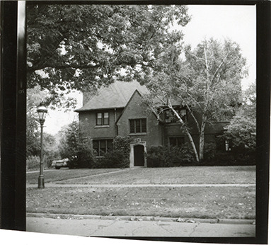 View of a two-story Tudor style brick house at 2460 Burns in the Indian Village neighborhood of Detroit, Michigan. The house, formerly owned by John Owen III, was built in 1928 and designed by Herman & Simons. Handwritten on back: "2460 Burns." Original photograph is reversed.