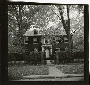 View of a two-story Colonial revival style brick house at 2485 Burns in the Indian Village neighborhood of Detroit, Michigan. The house, formerly owned by J. Farrand Williams, was built in 1930 and designed by Maurice V. Rogers. Handwritten on back: "2485 Burns." Handwritten on sleeve: "Frannie Dodge's house." Original photograph is reversed.