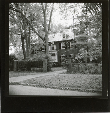 View of a two-story Colonial revival style brick house at 2485 Burns in the Indian Village neighborhood of Detroit, Michigan. The house, formerly owned by J. Farrand Williams, was built in 1930 and designed by Maurice V. Rogers. Handwritten on back: "2485 Burns." Handwritten on sleeve: "Frannie Dodge's house." Original photograph is reversed.