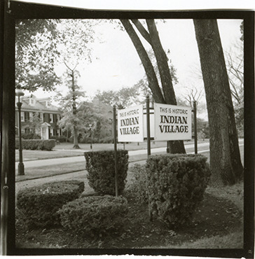 View of sign on the northeast corner of Iroquois and Kercheval that reads: "This is historic Indian Village." Handwritten on back: " Iroq. & Kercheval, N.E. corner." Original photograph is reversed.