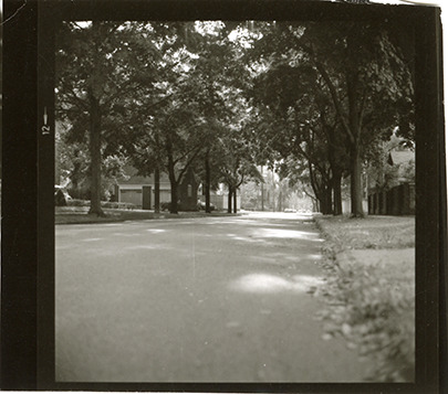 View of St. Paul Ave. between Burns and Iroquois, in the Indian Village neighborhood of Detroit, Michigan. Handwritten on back: "St. Paul looking west between Burns and Iroquois." Original photograph is reversed.