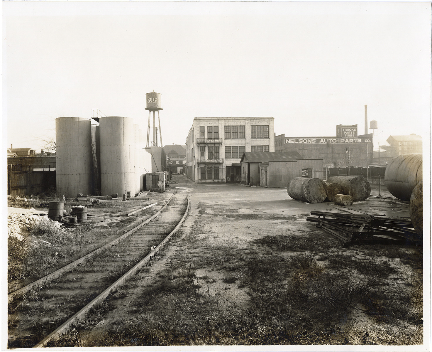 Rear view of the Gulf Refining Company. Oil storage tanks and railroad tracks in foreground; "Gulf" water tower and Nelson's Auto Parts Co. in background. Stamped on back: "Detroit Commercial Photo Co., commercial photographers, 25th floor, First National Bank Bldg., Cherry 2582, Detroit, Mich."
