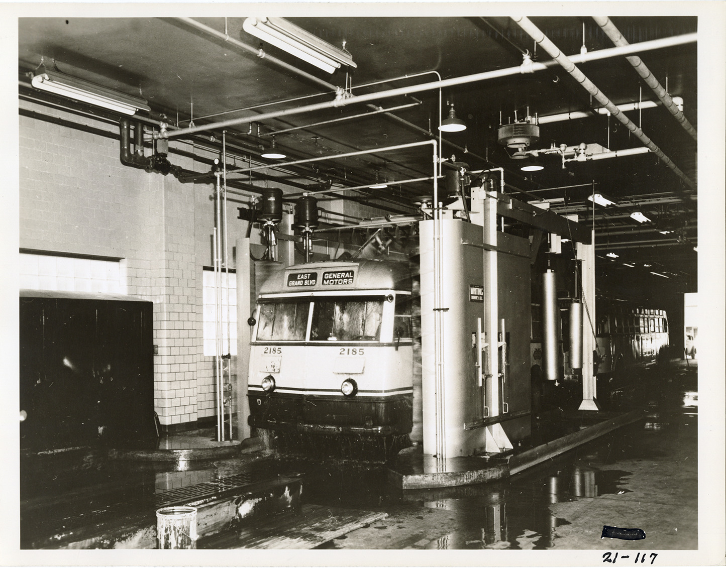 View of a East Grand Blvd./General Motors Detroit bus in Whiting mechanical bus washer in Gilbert terminal. Typed on back: "No. 21-117. Whiting mechanical bus washer. Type C.E.R. The final rinsing sprays can be seen." Stamped on back: "Built by Whiting Corporation, Harvey, Ill. (Chicago Suburb)." Handwritten on back: "Gilbert terminal, 1948."