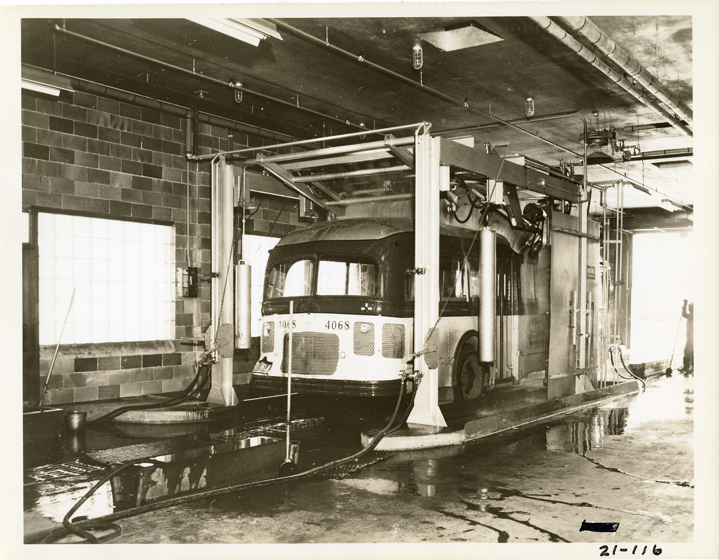 View of a Detroit bus in a Whiting mechanical bus washer in Coolidge terminal. Typed on back: "No. 21-116. Whiting mechanical bus washer. Type C.E.R., showing top brushes." Stamped on back: "Built by Whiting Corporation, Harvey, Ill. (Chicago Suburb)." Handwritten on back: "Coolidge terminal, 1948."