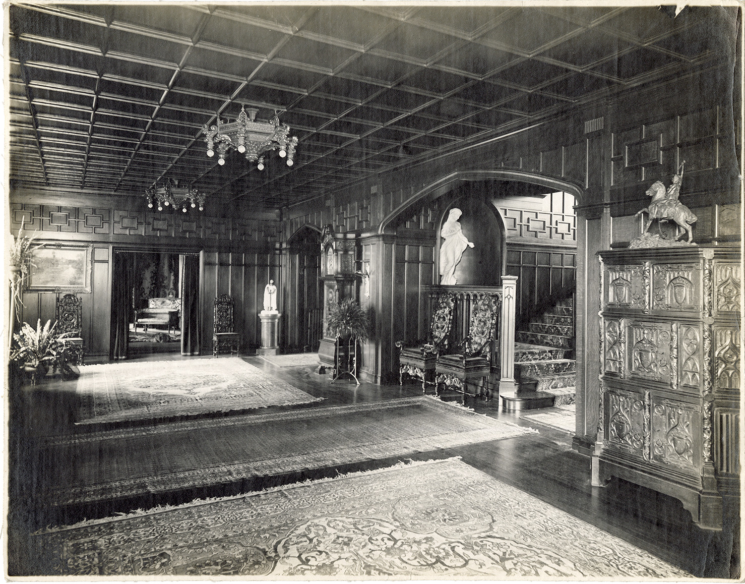 View of main hallway leading to drawing room in the Dr. R. Adlington Newman house on 1630 (7900) East Jefferson Avenue. Wood-paneled room is furnished with chairs, chest, grandfather clock and statues. Staircase on right. Handwritten on back: "May 1909, hall looking towards drawing room. 1630 East Jefferson."