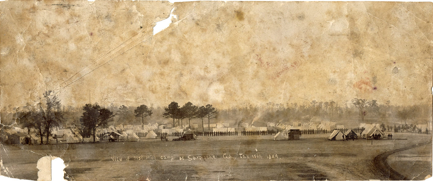 Favorite this☆ 31st Michigan Infantry camp at Savannah, Georgia Description: View of the 31st Michigan Infantry camp at Savannah, Georgia during the Spanish-American War. Printed on front: "View of 31st Mich. camp at Savannah, Ga., Jan. 18th, 1899." Details Resource ID: bh029296 Subject: Spanish-American War, 1898 United States. Army. Michigan Infantry Regiment, 31st (1898-1899) Military camps--Georgia--Savannah Tents--Georgia--Savannah Photographic prints Date Issued: 1899-01-18 Format: 1 photographic print ; 4 x 9.5 in. Member of: Burton Historical Collection Filing Location: MS/Scarlett, John Roy, 1:21 Rights: Physical rights are retained by DPL. Copyright is retained in accordance with U.S. copyright laws.