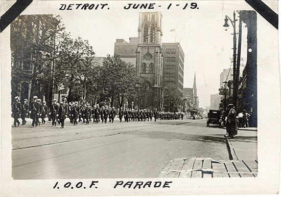 Favorite this☆ Oddfellows parade Description: View of uniformed men marching in Oddfellows Parade. Handwritten on front: "Detroit, June-1-19, I.O.O.F. parade." Details Resource ID: bh029318 Subject: Parades--Michigan--Detroit Independent Order of Oddfellows Photographic prints Date Issued: 1919-06-01 Format: 1 photographic print ; 2.5 x 3.75 in. Member of: Burton Historical Collection Filing Location: D/Parades Rights: Physical rights are retained by DPL. Copyright is retained in accordance with U.S. copyright laws.