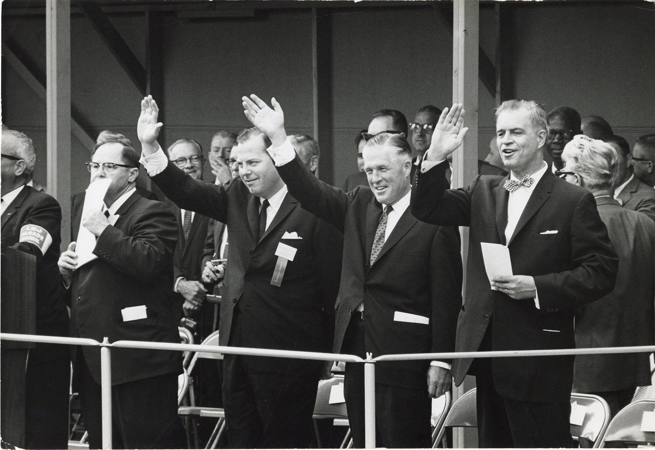 View of Jerome Cavanagh, George Romney and G. Mennen Williams at 1965 Labor Day parade. Stamped on back: "Joe Clark, H.B.S.S., 8775 West 9 Mile Road, Oak Park, Mich. 48237. 399-4480. Pictures that tell a story." Handwritten on back: "Mayor Cavanagh, Gov. Romney and Soapy Williams at Labor Day parade, 1965."