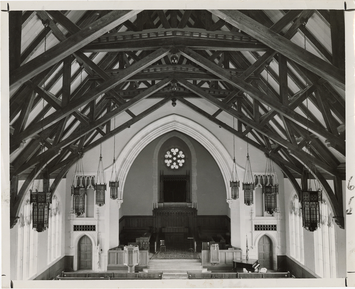 Interior view of the Covenant Baptist Church, showing beams on vaulted ceiling, rose window and altar. Label on back: "Covenant Baptist Church, 18700 James Couzens Highway, the Rev. Warner R. Cole, pastor. Repetition of the Gothic arch and the intricately timbered ceiling lend impressive dignity." Stamped on back: "Apr 9, 1950." Handwritten on back: "Covenant Baptist, 18700 James Couzens."