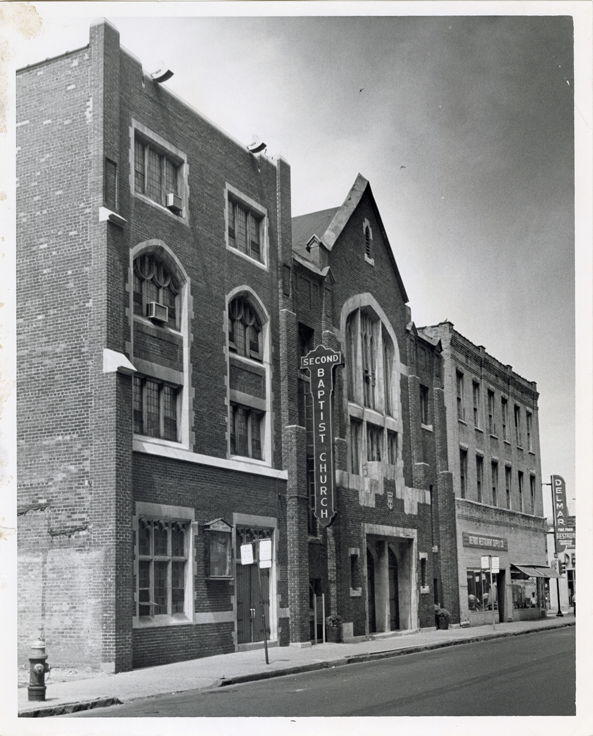 View of Second Baptist Church. Stamped on back: "Les Poosch, Detroit Free Press, Jul 7, 1964." Handwritten on back: "Historic 2nd Baptist Church."