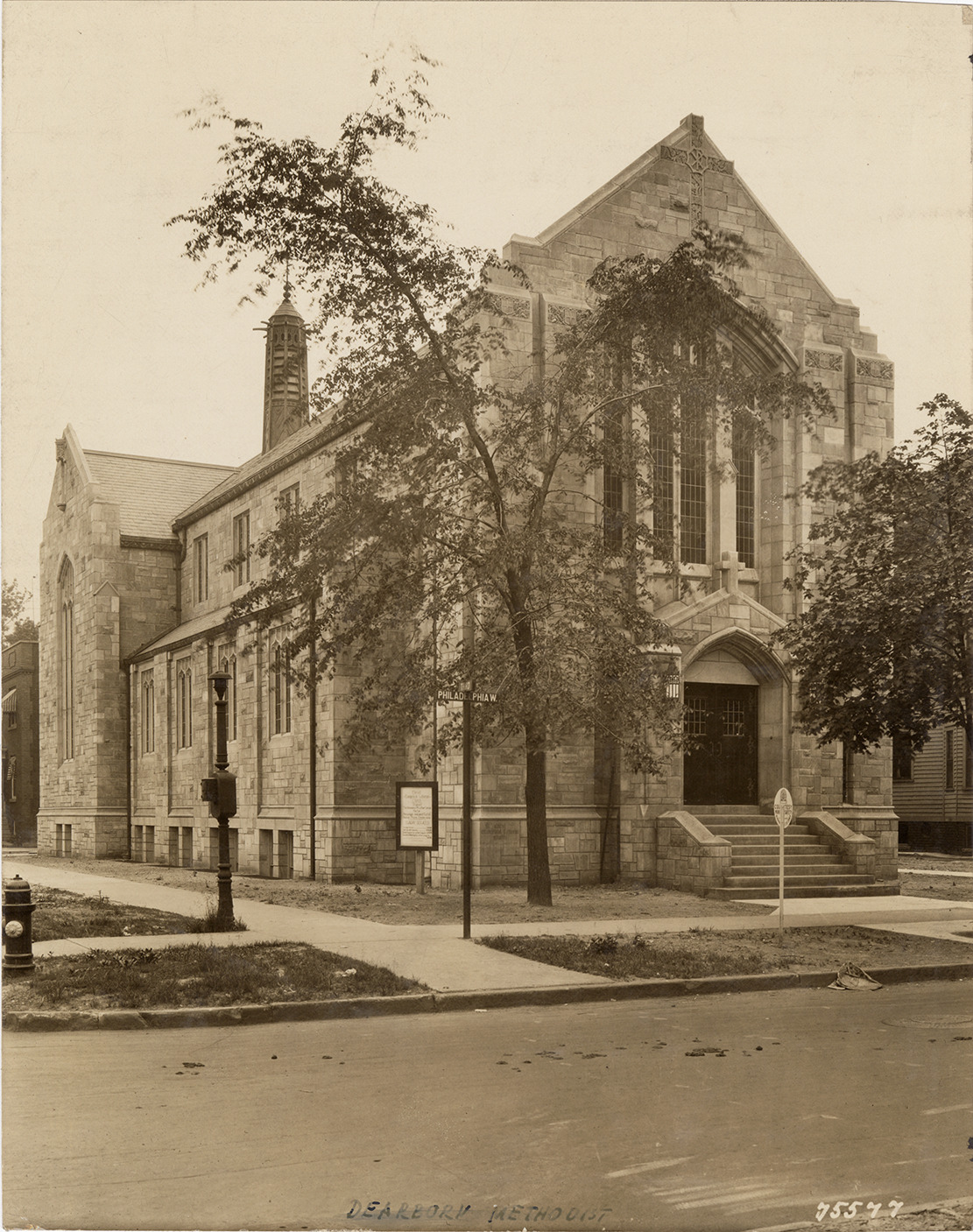 View of the Christ Evangelical Lutheran Church, located on the corner of Third and Philadelphia Streets. Church was designed by George D. Mason & Co. Handwritten on front: "Dearborn Methodist." Label on back: "Subject: Christ Evangelical Lutheran Church, Detroit, Michigan. Philadelphia & Third." Architect: "George D. Mason & Company. Cut stone contractor: Wolverine Cut Stone Co. When using this photo for publication purposes please credit Indiana Limestone Company, Architects' Service Bureau, P.O. Box 308, Bedford, Ind. The Nation's building stone." Stamped on back: "Manning Bros., commercial photographers. 504-505 Lincoln Building. Corner State and Park Sts., Detroit, Mich." and "George D. Mason & Co., architects. 409 Griswold St., Detroit, Mich." Handwritten on back: "Third and Philadelphia Sts."