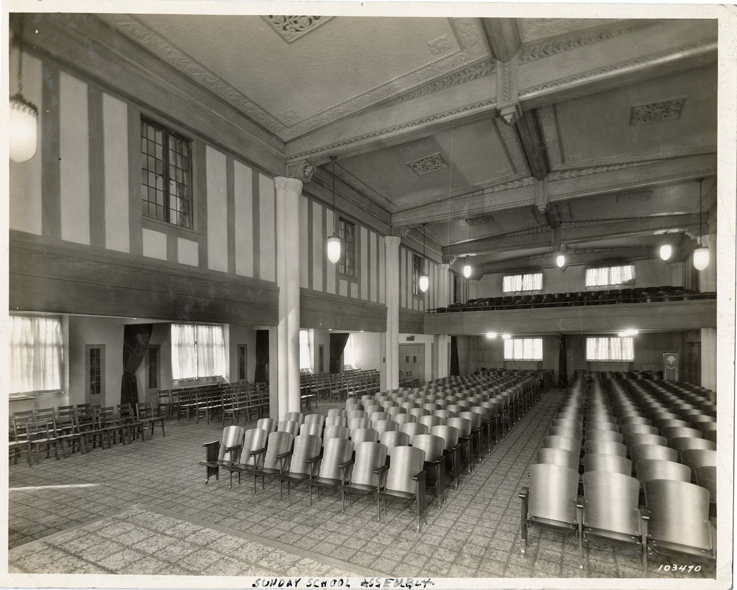 View of the assembly room in the parish house of the First English Evangelical Lutheran Church, designed by George D. Mason & Co. Rows of seating in foreground; balcony in background. Handwritten on front: "Sunday school assembly." Typed on back: "Main assembly room in parish house at First Evangelical Lutheran Church, Mt. Elliot & Pulford Ave., Detroit, Michigan. George D. Mason & Co., archt. Mr. David H. Williams, in charge." Stamped on back: "Manning Bros., commercial photographers. 504-505 Lincoln Building. Corner State and Park Sts., Detroit, Mich."