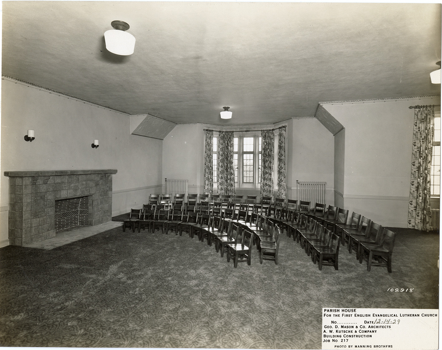 View of a meeting room in the parish house of the First English Evangelical Lutheran Church, designed by George D. Mason & Co. Room is furnished rows of chairs. Fireplace on left. Printed on front: "Parish house for the First English Evangelical Lutheran Church. No. [blank]. Date: 12-14-29. Geo. D. Mason & Co., architects. A.W. Kutsche & Company, building construction. Job no. 217. Photo by Manning Bros."