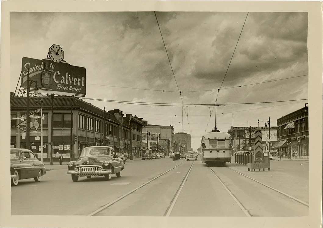 Favorite this☆ Traffic on Woodward Avenue Description: View of cars, streetcar and commercial buildings on Woodward Ave. Billboard and clock for Calvert whiskey on left. Billboard reads: "Switch to Calvert, tastes better!" Details Resource ID: bh029396 Subject: Woodward Avenue (Mich.) Streets--Michigan--Detroit Commercial buildings--Michigan--Detroit Automobiles--Michigan--Detroit Streetcars (Cable cars)--Michigan--Detroit Billboards--Michigan--Detroit Clocks and watches--Michigan--Detroit Advertising--Alcoholic beverages Photographic prints Date Issued: Unknown year in the decade of the 1950s Format: 1 photographic print ; 5 x 7 in. Member of: Burton Historical Collection Filing Location: D/Streets-Woodward, 1950s Rights: Physical rights are retained by DPL. Copyright is retained in accordance with U.S. copyright laws.