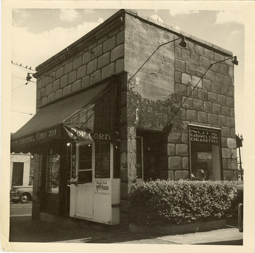 View of a popcorn store located at 203 Woodward Ave. near the Bob-Lo dock. Signs on awning and windows read: "World's best popcorn, nuts, caramel corn. Nuts, caramel corn, cigarettes, pistachio."