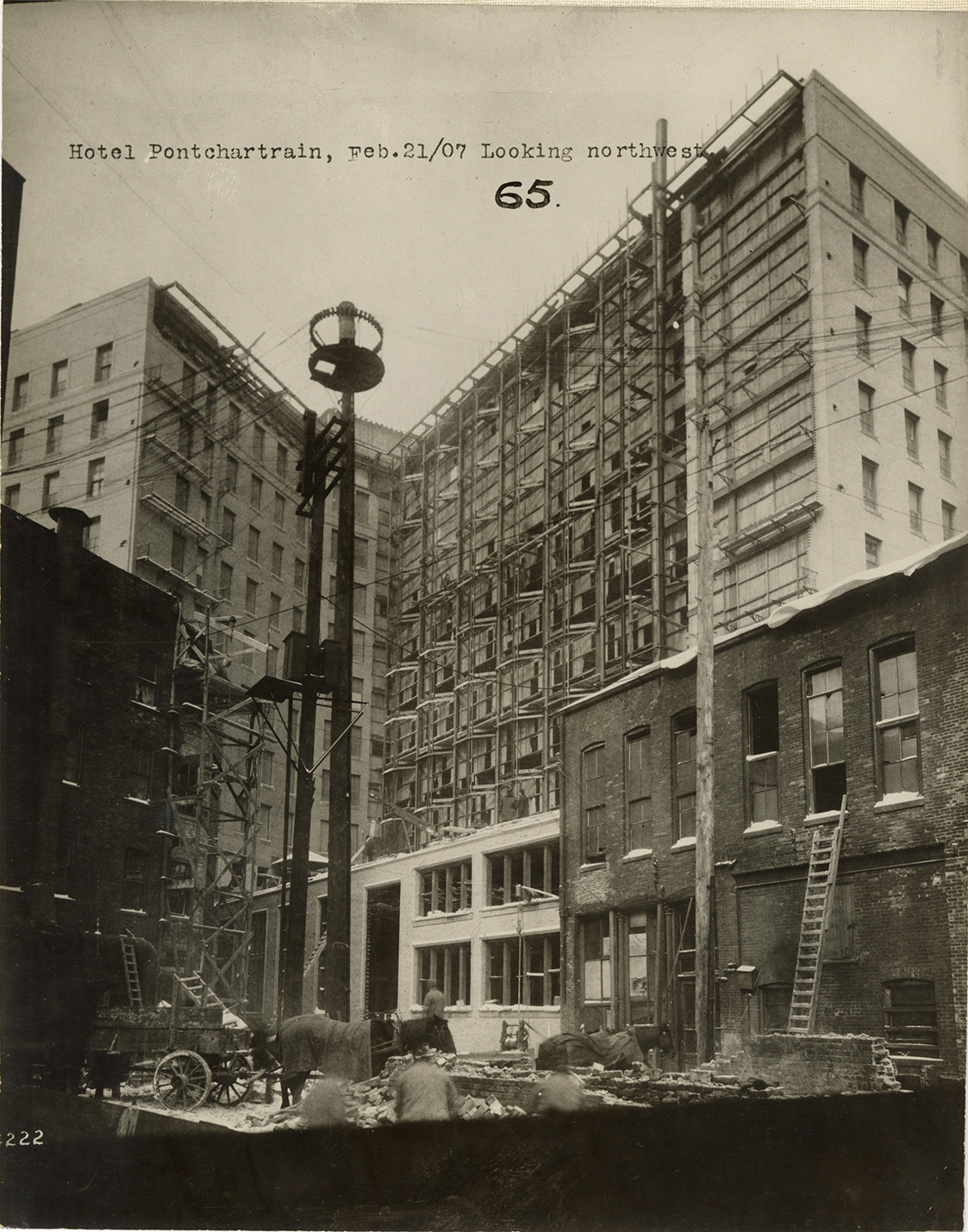 View of Hotel Pontchartrain during construction, showing structural framework and partially completed facade. Construction workers and horse-drawn wagon in foreground. Typed on front: "Hotel Pontchartrain, Feb. 21/07. Looking northwest." Stamped on back: "W.D. Benham, commercial photographer, 414 Wetherbee Bldg., Detroit, Mich."
